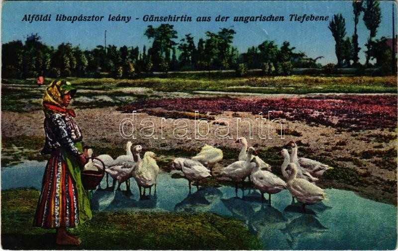 Alföldi libapásztor leány, magyar folklór. Vasúti levelezőlapárusítás 1916. Erdélyi udvari fényképész felvétele / Gänsehirtin aus der ungarischen Tiefebene / Hungarian folklore (EK)