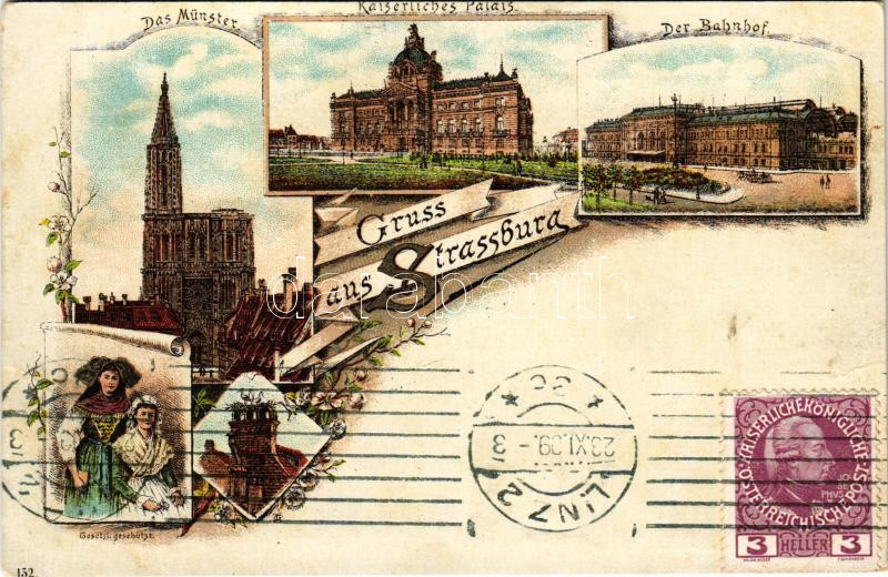Beschreibung: 1909 Strasbourg, Strassburg; Das Münster, Kaiserliches Palais, Der Bahnhof / church, palace, railway station. Art Nouveau, floral, litho, TCV card (small tear)