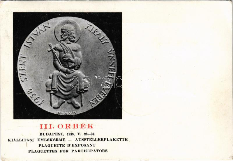 Szent István király ünnepi évében. III. ORBÉK (Országos Magyar Bélyegkiállítás) Budapest 1938. V. 22-30. kiállítási emlékérme + So. Stpl. (EK)