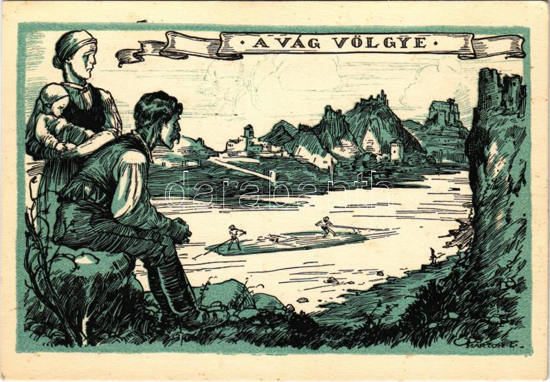 A Vág völgye, vize fája magyar vágya, tutajos cserkészek. Kiadja a Magyar Nemzeti Szövetség, Hornyánszky Viktor rt. / Hungarian irredenta propaganda art postcard from Váh river, scouts rafting s: Márton L.