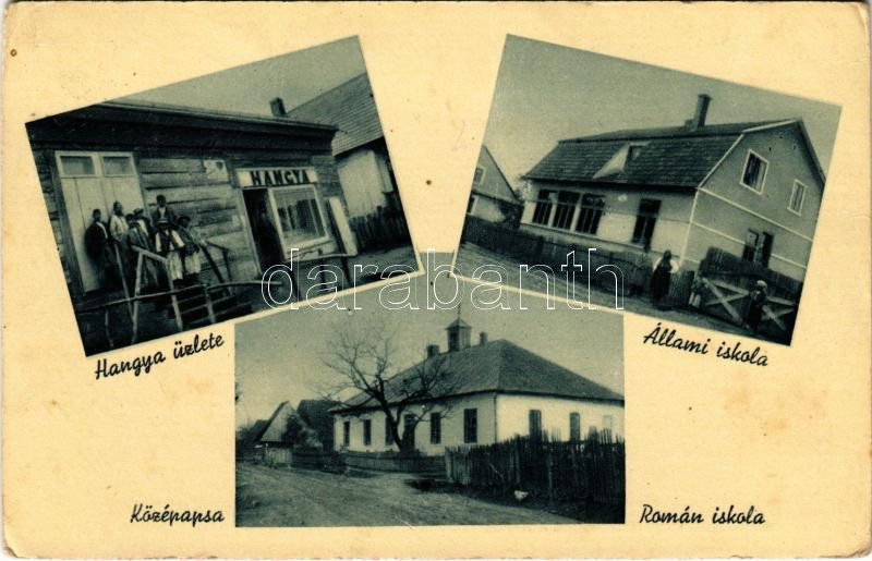Beschreibung: 1943 Középapsa, Strední Apsa; állami és román iskola, Hangya szövetkezet üzlete és saját kiadása / cooperative shop, schools (fa)