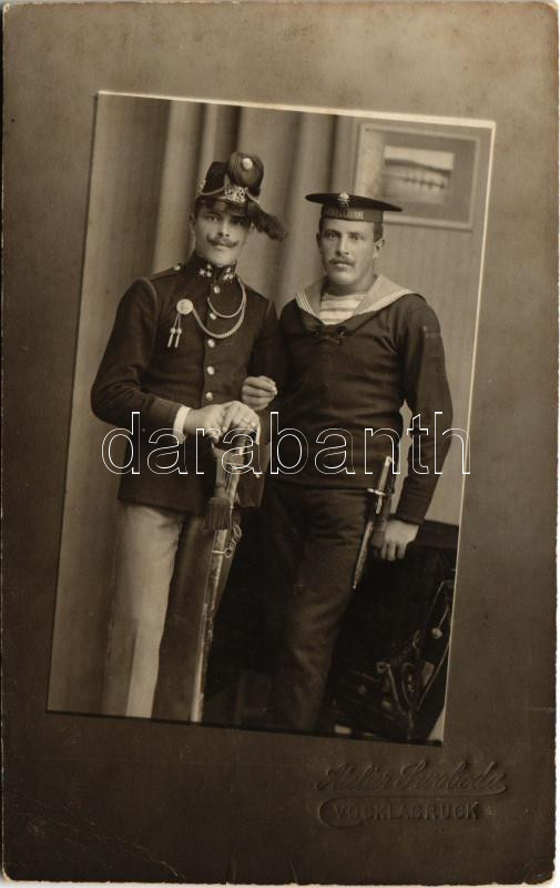 Beschreibung: Osztrák-magyar katona és haditengerészeti matróz közös képe / WWI Austro-Hungarian Navy, K.u.K. Kriegsmarine, soldier and mariner. Atelier Swoboda (Vöcklabruck) photo (EB)