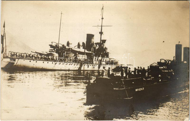 Beschreibung: SMS Warasdiner Osztrák-Magyar Haditengerészet rombolója matrózokkal és csatahajóval / K.u.K. Kriegsmarine Zerstörer / WWI Austro-Hungarian Navy destroyer and battleship, mariners. photo