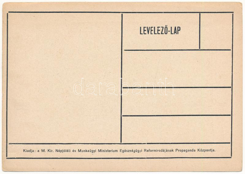 Zárt ajtó, csukott ablak biztos betegség. Levegő, sport, napfény erő és egészség. Kiadja a M. Kir. Népjóléti és Munkaügyi Ministerium Egészségügyi Reformirodájának Propaganda Központja, Tervezte: Pollerman s: Lossonczy Tamás (1904-2009) (EK)