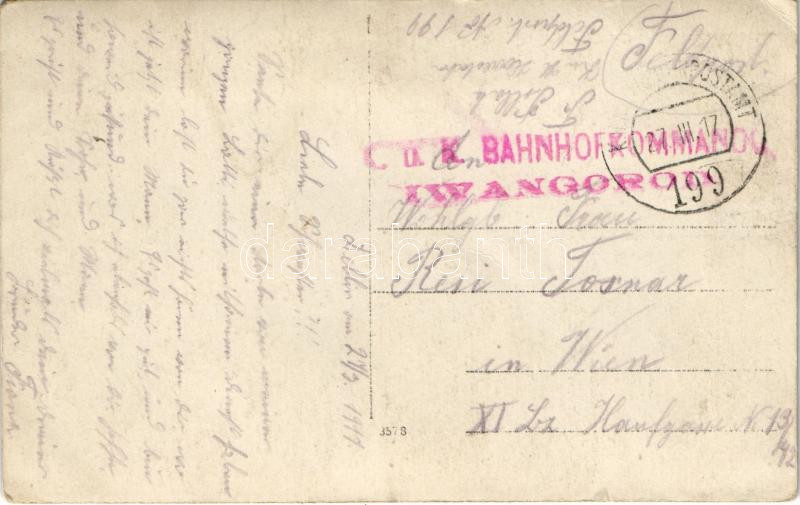 Beschreibung: 1917 Heeresbahn Nord / WWI Austro-Hungarian K.u.K. military, soldiers at the railway station. photo + "K.u.K. Bahnhofkommando Iwangorod" (kis szakadás / small tear)