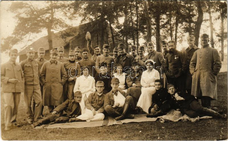 1917 Pardubice, Pardubitz; Osztrák-magyar katonák és nővérek a hadikórház mellett / WWI Austro-Hungarian K.u.K. military hospital, soldiers and nurses. photo (EK)