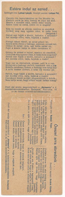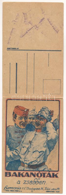 Beschreibung: Bakanóták a zsebben. Harmónia rt. kiadása - 2-részes kinyitható reklám képeslap / Hungarian military songs - 2-tiled folding advertising postcard