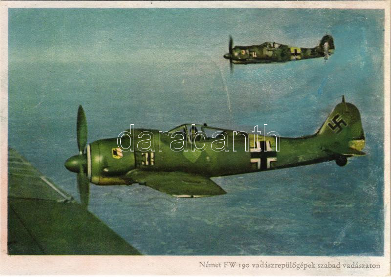 Második világháborús német katonai lap. Német FW 190 vadászrepülőgépek szabad vadászaton. C. Berger haditudósító felvétele. Carl Werner / WWII German military aircrafts, swastika (r)