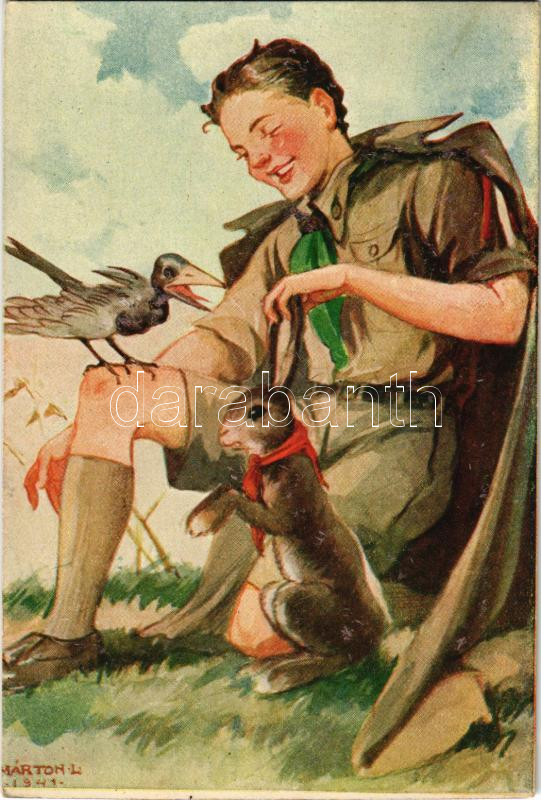 1943 Cserkész nyúllal és madárral, Kiadja a Márton L.-féle Cserkészlev... https://www.darabanth.com/de/438-Fernauktion/438.0/Ansichtskarten/Pfadfinder~2500039/1943-Cserkesz-nyullal-es-madarral-Kiadja-a-Marton-L-fele-Cserkeszlevelezolapok-Kiadohivat~II2862161