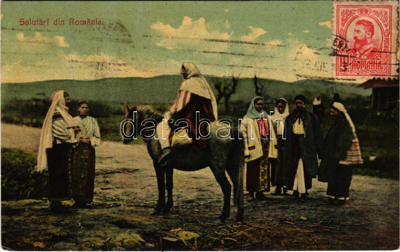 1910 Salutari din Romania, folklore. TCV card (fl) https://www.darabanth.com/de/438-Fernauktion/438.0/Ansichtskarten/Rumanien~2500059/1910-Salutari-din-Romania-folklore-TCV-card-fl~II2867251