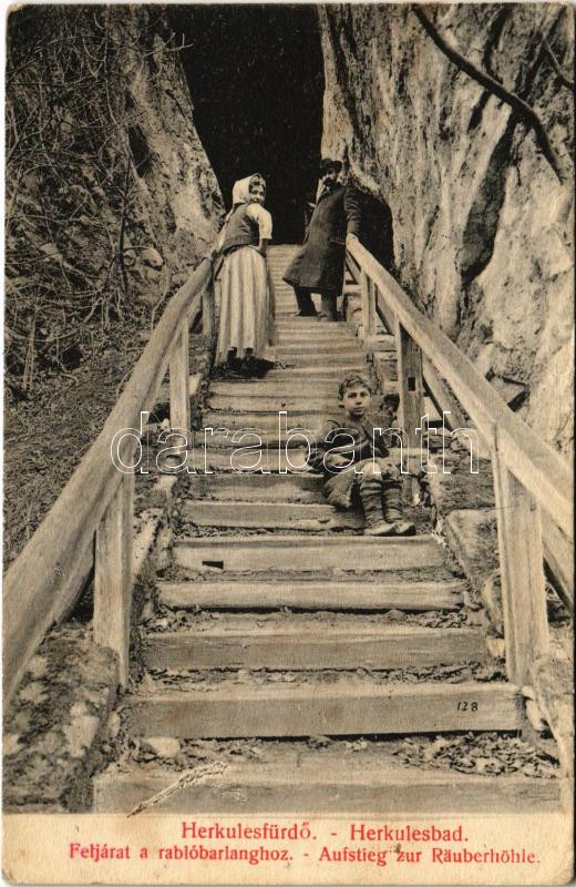 1908 Herkulesfürdő, Baile Herculane; Feljárat a Rablóbarlanghoz. Eberle Keresztély kiadása / Aufstieg zur Räuberhöhle / stairs to the cave (kis szakadás / small tear)