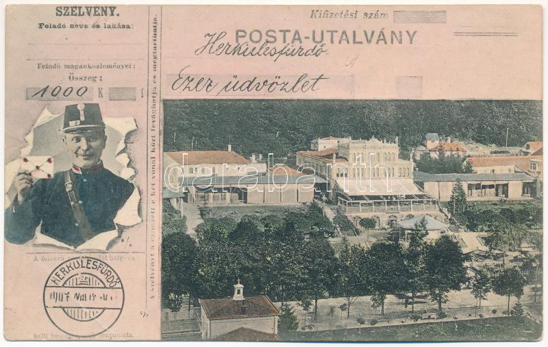 1908 Herkulesfürdő, Baile Herculane; fürdő. Posta-Utalvány montázs postással. Eberle Keresztély kiadása / spa, bath. Art Nouveau montage with postal order and postman (EB)