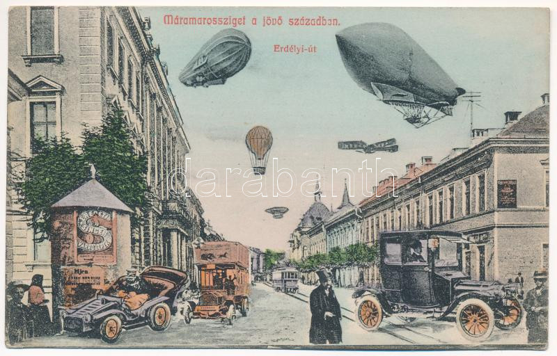 1910 Máramarossziget, Sighetu Marmatiei; Erdélyi út a jövőben, montázs... https://www.darabanth.com/de/438-Fernauktion/438.0/Ansichtskarten/Siebenburgen~2500006/1910-Maramarossziget-Sighetu-Marmatiei-Erdelyi-ut-a-jovoben-montazs-Kaufman-Abraham-es-~II2869823