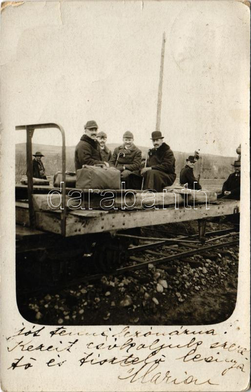 Beschreibung: 1912 Marosvásárhely, Targu Mures; utazás iparvasúti szerelvényen, kakastollas csendőr, vasút, vonat / travelling on industrial railway, train, gendarme. photo (fa)