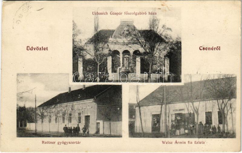 Beschreibung: 1913 Csene, Tschene, Cenej, Cenei; Uzbasich Gáspár főszolgabíró háza, Ruttner gyógyszertár, Weisz Ármin fia üzlete és saját kiadása / judge's villa, pharmacy, shop