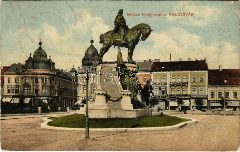 1913 Kolozsvár, Cluj; Mátyás király szobor, Haraszthy Jenő és Farkas ü... https://www.darabanth.com/de/438-Fernauktion/438.0/Ansichtskarten/Siebenburgen~2500006/1913-Kolozsvar-Cluj-Matyas-kiraly-szobor-Haraszthy-Jeno-es-Farkas-uzlete-Erdelyi-bank-d~II2860639