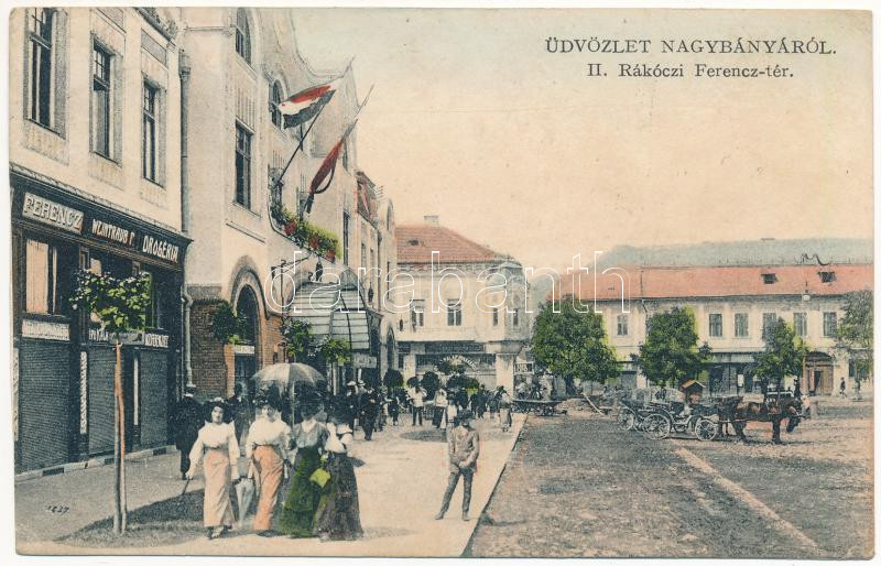 1913 Nagybánya, Baia Mare; II. Rákóczi Ferenc tér, Weintraub F. drogéria, üzletek, István király szálló magyar zászlókkal. W. L. Bp. 6034. 1912-14. Krizsanovszky Lőrinc kiadása / square, drug store, shops, hotel with Hungarian flags (r)