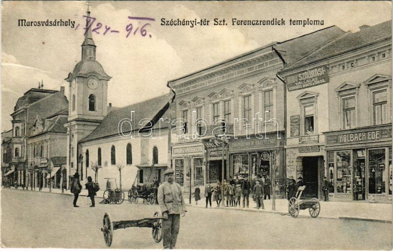 1916 Marosvásárhely, Targu Mures; Széchenyi tér, Szt. Ferenc rendiek temploma, talicskás, Hamburgi kávébehozatal, Löbl, Joánovics testvérek és Holbach Ede üzlete, dohány és szivar nagytÅ‘zsde, Szekeres Ferenc cipész, Schwartz Móritz és társa "Ohio" szállÃtási vállalat irodája. Porjes S. Sándor kiadása / square, church, shops (EK)