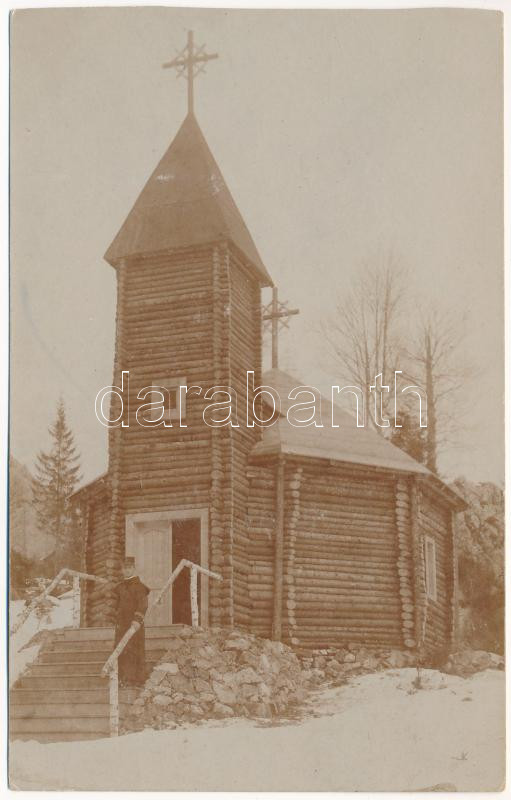 1917 Gyergyói-havasok, Muntii Giurgeu (Gyergyószentmiklós, Gheorgheni); Erdei kis fatemplom, katonai tábori lelkész / wooden church in the forest, military camp chaplain. photo