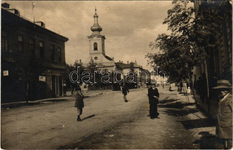 Beschreibung: 1917 Máramarossziget, Sighetu Marmatiei; templom, utca, üzletek / street view, church, shops. photo (EK)