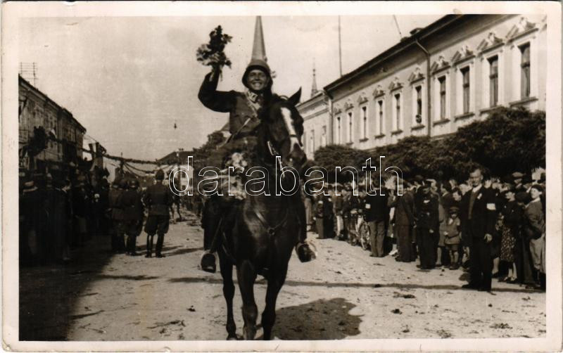 Beschreibung: 1940 Máramarossziget, Sighetu Marmatiei; bevonulás / entry of the Hungarian troops. photo + "1940 Máramarossziget visszatért" So. Stpl. (kis szakadás / small tear)