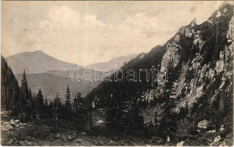 Beschreibung: Bucsecs-hegység, Butschetsch, Muntii Bucegi; Malajester-Schlucht mit Schutzhütte. Siebenbürgische Karpathen / szurdok, menedékház, turistaház. Wilhelm Hiemesch kiadása / mountain rest house, tourist house, chalet (EK)
