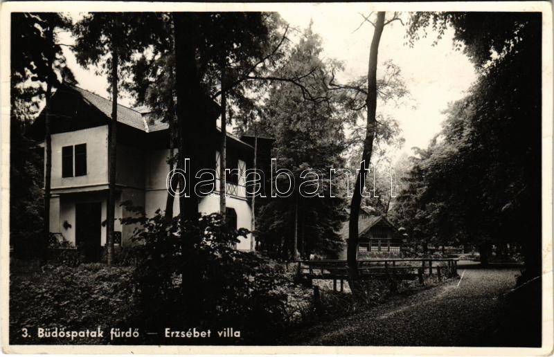 Beschreibung: Büdöspataka-fürdő, Bizusa-Bai; Erzsébet villa. Verbiczky Géza kiadása / villa, spa (EB)