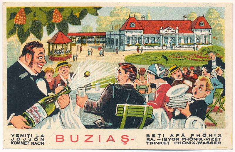 Buziásfürdő, Baile Buzias; Phönix víz reklámlap a kaszinóval. Humoros litho művészlap / Hungarian mineral water advertisement, casino. Humorous litho art postcard (fa)