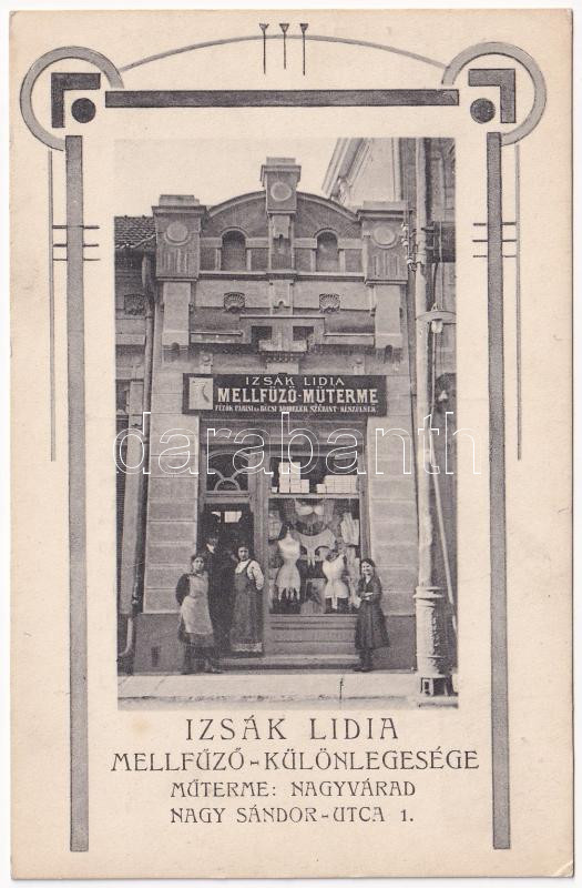 Nagyvárad, Oradea; Izsák Lídia mellfűző műterme, fűző üzlet. Nagy Sánd... https://www.darabanth.com/de/438-Fernauktion/438.0/Ansichtskarten/Siebenburgen~2500006/Nagyvarad-Oradea-Izsak-Lidia-mellfuzo-muterme-fuzo-uzlet-Nagy-Sandor-utca-1-Wagner-Vi~II2863035