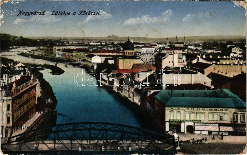 Nagyvárad, Oradea; látkép a Körössel, Gazdasági Iparbank, Strohmayer Pál, Jánky Antal üzlete, zsinagóga, híd. Kiadja Sonnenfeld Adolf műintézete / Cris riverside, bank, shops, synagogue, bridge (felszíni sérülések / surface damage)