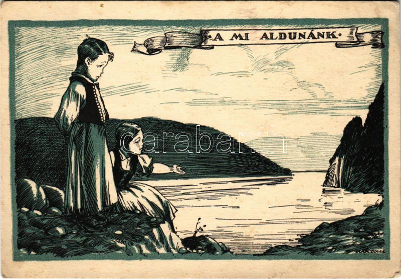 Orsova, A mi Aldunánk. Buda, Mohács, Nándornál elfutó, tán honom könnye vagy te nagy folyó? Kiadja a Magyar Nemzeti Szövetség, Hornyánszky Viktor rt. / Hungarian irredenta propaganda art postcard from Orsova s: Márton L. (fl)
