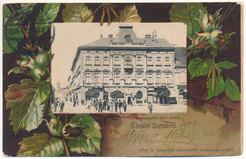 Szatmárnémeti, Satu Mare; Kereskedelmi bank palota, gyógyszertár a szentháromsághoz, Scheiber üzlete. Lővy M. kiadása, szecessziós mogyorós litho keret / bank palace, shops, pharmacy. Art Nouveau, litho (EK)
