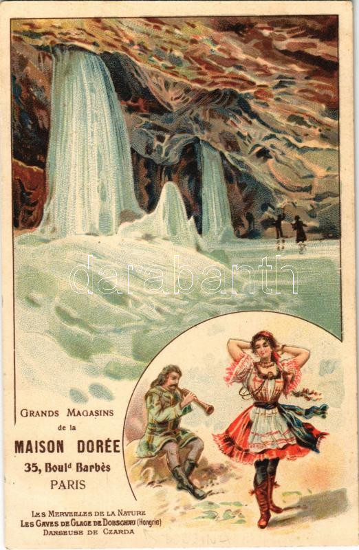 Dobsina, Dobschau; Dobsinai-jégbarlang, belső, csárdás, magyar folklór / Les Caves de Glace de Dobschau, Danseuse de Czarda / ice cave, interior, Hungarian folklore, traditional dance. Imp. A. Norgeu (Paris) Art Nouveau, litho (fl)
