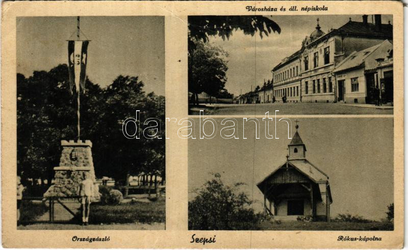 Beschreibung: Szepsi, Abaújszepsi, Moldava nad Bodvou; Országzászló, Városháza és Állami iskola, Rókus kápolna / Hungarian flag, town hall, school, chapel (fa)