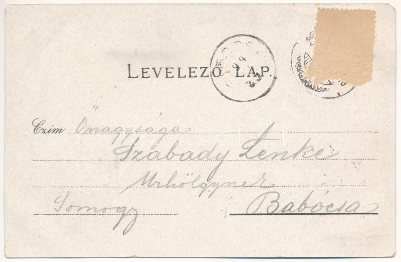 Beschreibung: 1899 (Vorläufer) Kaposvár, Római katolikus templom, Cukorgyár, Új állami főgimnázium. Gerő Zsigmond kiadása. Art Nouveau, floral, litho (Rb)