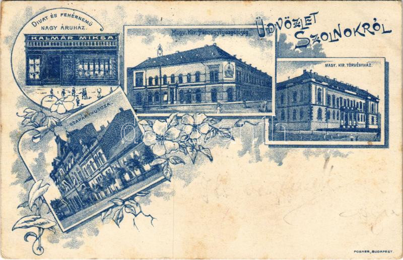 1899 (Vorläufer) Szolnok, M. kir. Pénzügyigazgatóság, M. kir. törvényház, Szapáry utca, Kalmár Miksa üzlete, Divat és fehérnemű nagyáruház. Posner, Budapest. Art Nouveau, floral (fl)
