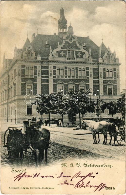 1900 Szeged, MÁV üzletvezetőség, lovaskocsik. Schmidt Edgar (EB) https://www.darabanth.com/de/438-Fernauktion/438.0/Ansichtskarten/Ungarn~2500005/1900-Szeged-MAV-uzletvezetoseg-lovaskocsik-Schmidt-Edgar-EB~II2871073