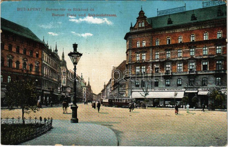 Beschreibung: 1914 Budapest VIII. Baross tér és Rákóczi út, Központi szálloda, kávéház és étterem, Debreczen szálloda, üzletek, villamos (EK)
