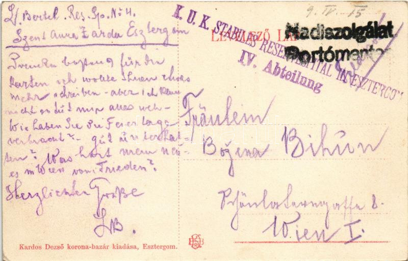 Beschreibung: 1915 Esztergom, Laktanya és kórház, K.u.K. katonák. Kardos Dezső kiadása + "K.u.K. Stabiles Reservespital in Esztergom IV. Abteilung" (EK)