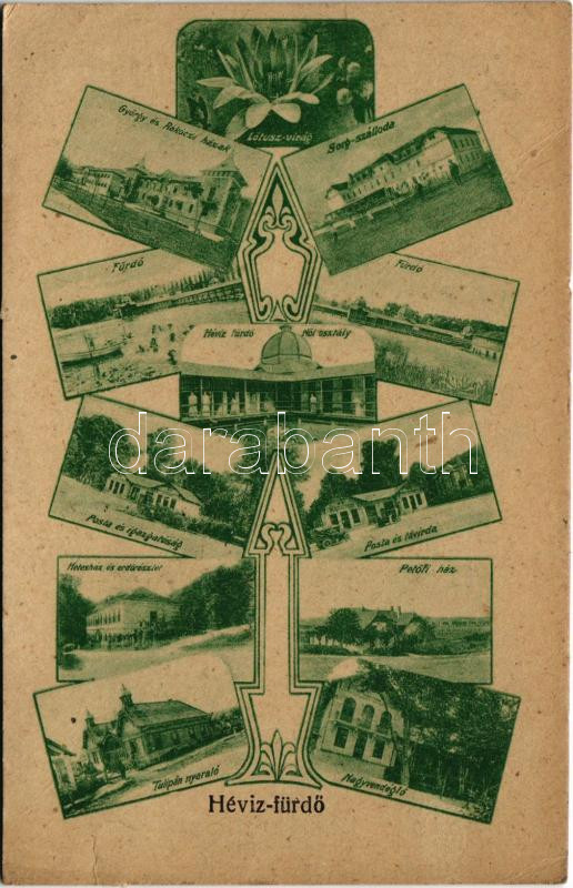 1921 Hévíz, Lótuszvirág, György és Rákóczi házak, Sorg szálloda, fürdő, Női osztály, Hetesház és erdő részlet, Posta és távirda, automobil, Tulipán nyaraló, Nagyvendéglő, Petőfi ház. Nádai Ignác kiadása. Art Nouveau (EK)