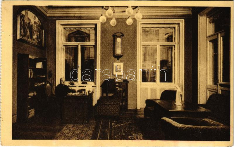 Beschreibung: 1942 Budapest V. Kegyes-tanítórendi gimnázium, igazgatói iroda, belső. Rigler r.-t. kiadása (képeslapfüzetből / from postcard booklet) (kis szakadás / small tear)