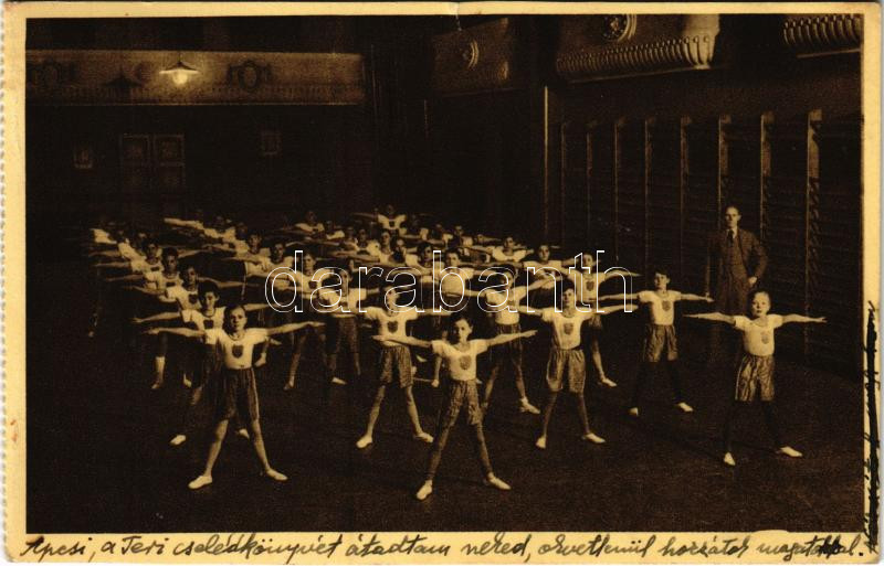Beschreibung: 1942 Budapest V. Kegyes-tanítórendi gimnázium, tornaterem, belső, tornaóra. Rigler r.-t. kiadása (képeslapfüzetből / from postcard booklet) (kis szakadás / small tear)