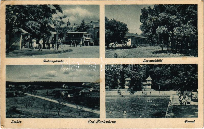 1944 Érd-Parkváros, Dohányáruda, Leventeüdülő, strand, autóbusz (fa) https://www.darabanth.com/de/438-Fernauktion/438.0/Ansichtskarten/Ungarn~2500005/1944-Erd-Parkvaros-Dohanyaruda-Leventeudulo-strand-autobusz-fa~II2869508