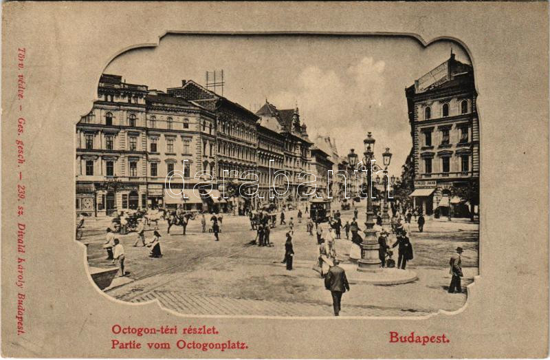Beschreibung: Budapest VI. Oktogon téri részlet, villamos, Kömlődi Jakab, Ernyei Lajos, Sokulski üzlete, lovas rendőr. Divald Károly 239. sz.