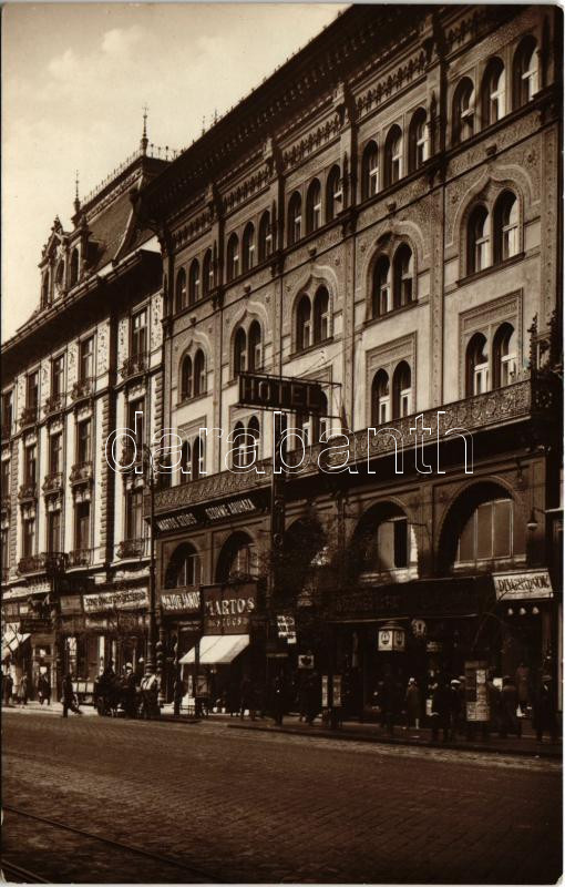 Budapest VII. Excelsior szálló, Martos Szűcs szőrmeáruháza, Major János üzlete, cukrászda, Goldner I. és fiai üzlete, Szent Rókus gyógyszertár, patika, Klein Gyula órás és ékszerész, Magyar Divatcsarnok