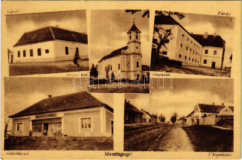 Mesztegnyő (Marcali), Iskola, Római katolikus templom, Zárda, utca rés... https://www.darabanth.com/de/438-Fernauktion/438.0/Ansichtskarten/Ungarn~2500005/Mesztegnyo-Marcali-Iskola-Romai-katolikus-templom-Zarda-utca-reszlet-szovetkezet-uzlete~II2856934