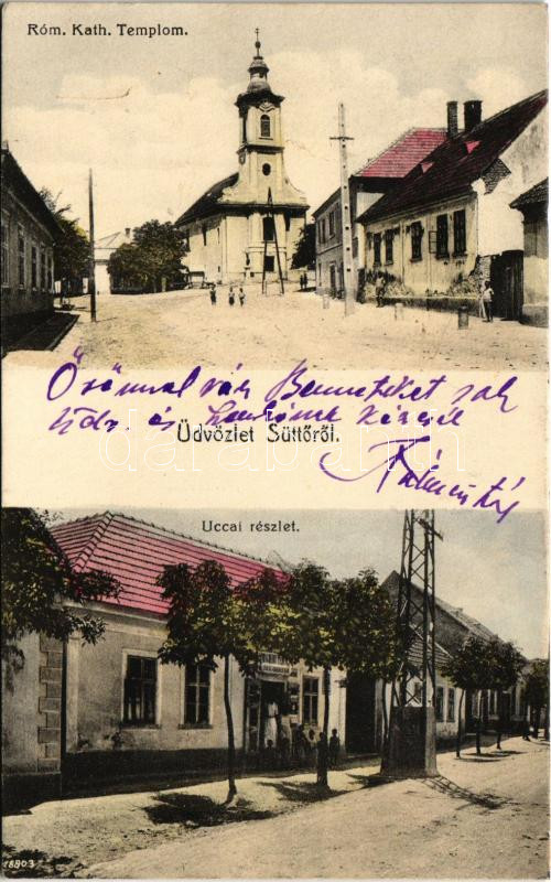 Beschreibung: Süttő, Római katolikus templom, utca, Lindscheidt Ferenc üzlete és saját kiadása