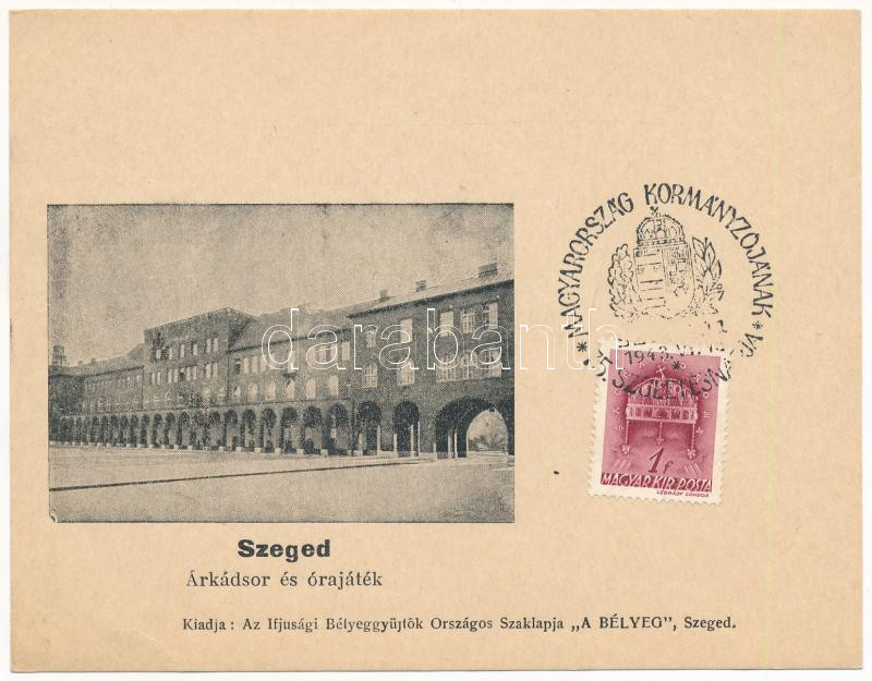 Szeged, Árkádsor és órajáték. Kiadja az Ifjúsági Béleggyűjtők Országos Szaklapja "A Bélyeg" + "Magyarország kormányzójának 75. születésnapja Szeged 1943. VI. 18." So. Stpl. (non PC)