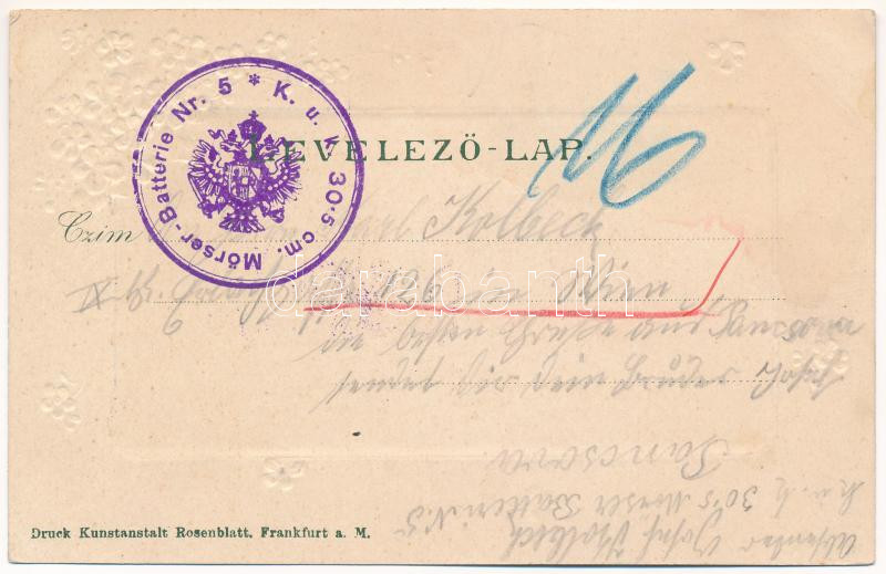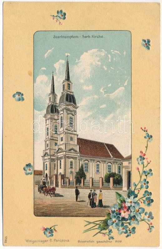 Pancsova, Pancevo; szerb templom. Witigschlager C. kiadása, szecessziós dombornyomott virágos litho / Serbian church. Art Nouveau, floral, embossed, litho + "K.u.k. 30,5 cm Mörser-Batterie Nr. 5."