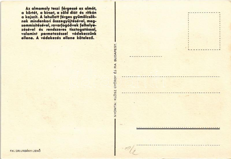 Az almamoly teszi férgessé az almát, a körtét, a birset, a zöld diót és ritkán a kajszit. A lehullott férges gyümölcsöknek mindenkori összegyűjtésével, megsemmisÃtésével, rovarfogóövek felhelyezésével és rendszeres tisztogatással, valamint permetezéssel védekezzünk ellene. A védekezés ellene kötelezÅ‘. MezÅ‘gazdasági propaganda. Nyomta Klösz György és Fia / Hungarian agricultural propaganda, apple moth extermination
